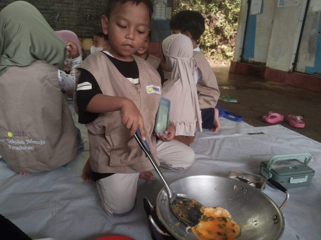 Dalam kegiatan Basic Fun Cooking, anak-anak diajak memasak lauk sederhana dengan langkah-langkah yang mudah dan aman. Guru berperan sebagai pendamping yang memberi arahan, bukan mengambil alih. Anak-anak belajar menyiapkan bahan, mengikuti urutan memasak, hingga menyajikan hasil masakan mereka. Proses ini dirancang agar anak menikmati setiap tahapan, bukan hanya berfokus pada hasil akhir.